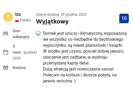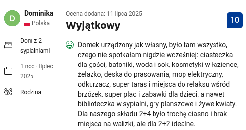 Zadbaliśmy również o komfort i dobrą zabawę najmłodszych gości. Na terenie obiektu dzieci mogą korzystać z małych domków do zabawy oraz toru przeszkód typu ninja, który zachęca do aktywności na świeżym powietrzu. W środku domku zadbaliśmy o gry planszowe dla dzieci w każdym wieku, a dla najmłodszych jest dostępne łóżeczko dziecięce. To miejsce przyjazne rodzinom, w którym dzieci mogą bezpiecznie się bawić, a dorośli spokojnie odpocząć.